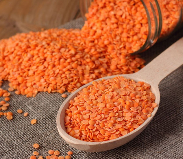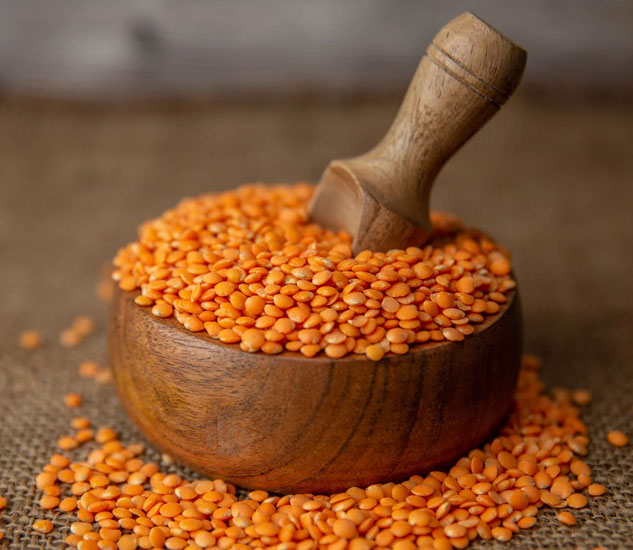 Red lentils with a mild, slightly sweet flavor, used in soups, stews, and curries.